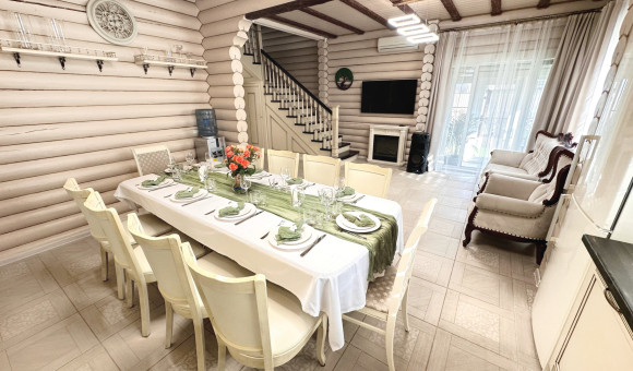- Кухня-гостиная: просторный стол на 10 персон, вся необходимая посуда и бытовая техника, включая посудомоечную машину, духовой шкаф, кофе-машину, тостер и чайник.